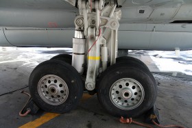 Detail hlavního podvozku, za povšimnutí stojí relativně velmi úzká kola (podvozek se zatahuje do křídla)