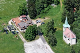 03.06. Vrchol Zvíčina (671 m.n.m.) s kostelíkem a turistickou Raisovou chatou, ke které byla v roce 1926 přistavěna malá 10m vysoká rozhledna s unikátní otáčivou kopulí. Foceno ze Zlínu Z-43 OK-FOH při přeletu z LKDK na LKKL