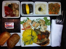 Hlavní chod v business class na lince Muscat - Káhira: sea food s cibulovou pizzou a rýží, salát z grilované zeleniny a hub zalitý balsamikem, humus (arabská pomaznáka z cizrny), vinné listy s citronem a olivový salát.